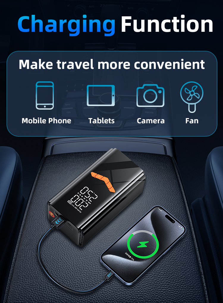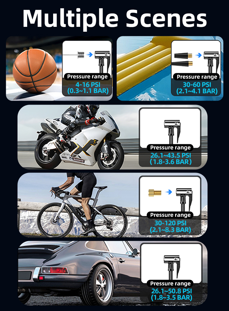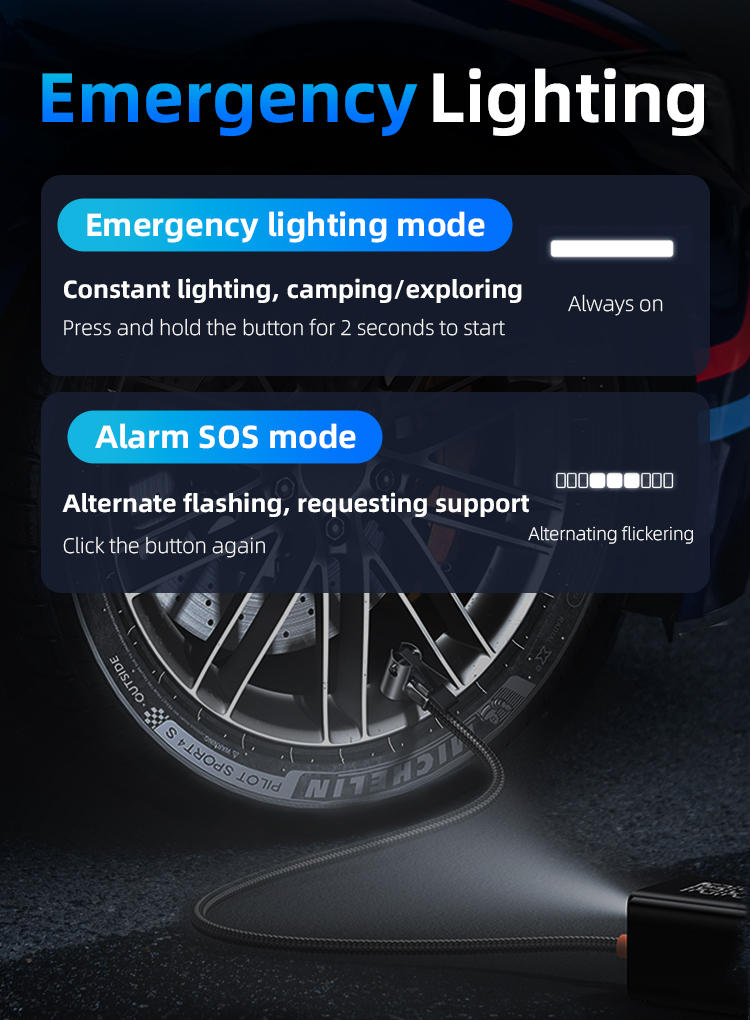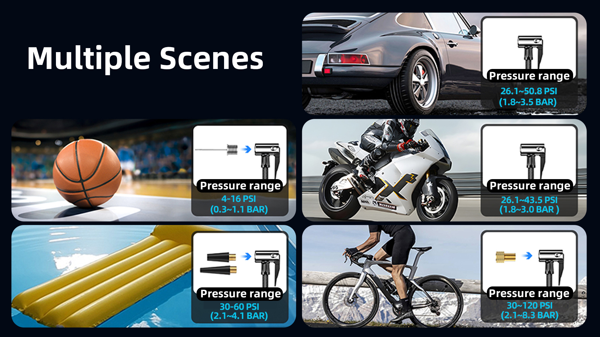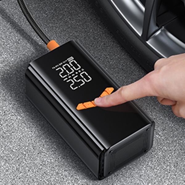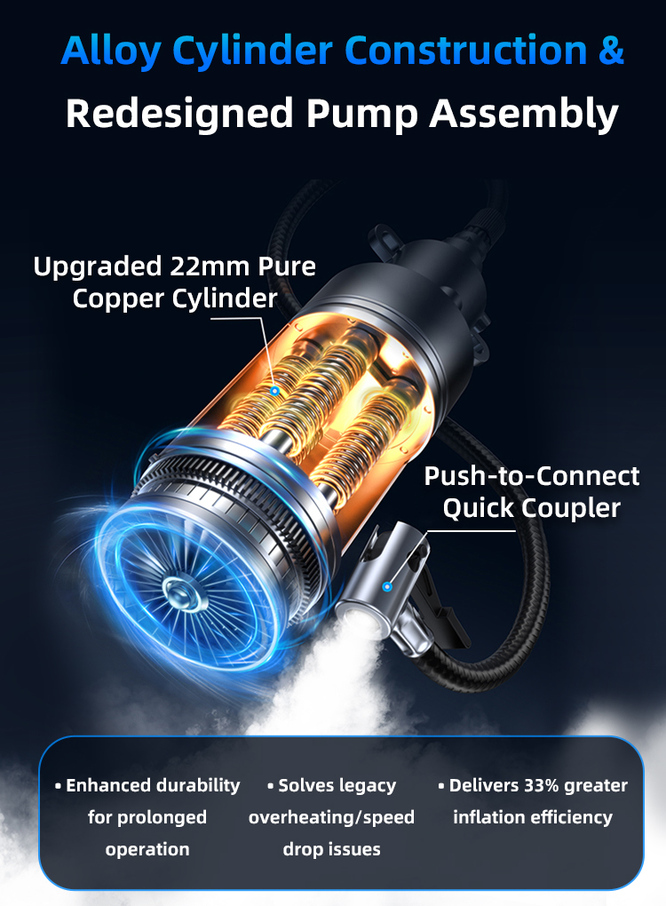 Revolutionary cordless design with smart monitoring: • No more cigarette lighter dependency • 360° free-position inflation • Military-grade pressure sensor • Auto-shutoff when reaching preset pressure