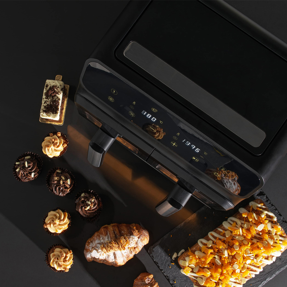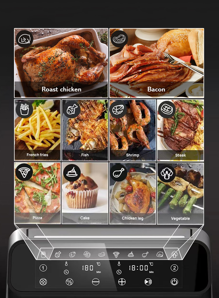 Use one zone or 2 zones together. Prepare different foods separately. Set different temperatures and cooking times for each zone.